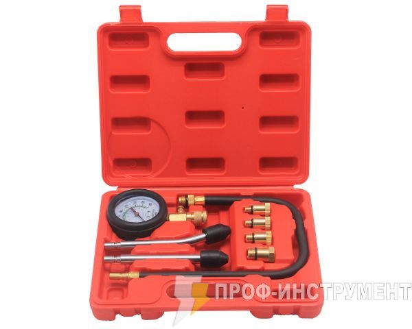 Компрессометр поставляется в комплекте с адаптерами для подключения к цилиндрам или форсункам большинства бензиновых двигателей в пластиковом кейсе для хранения и переноски.
