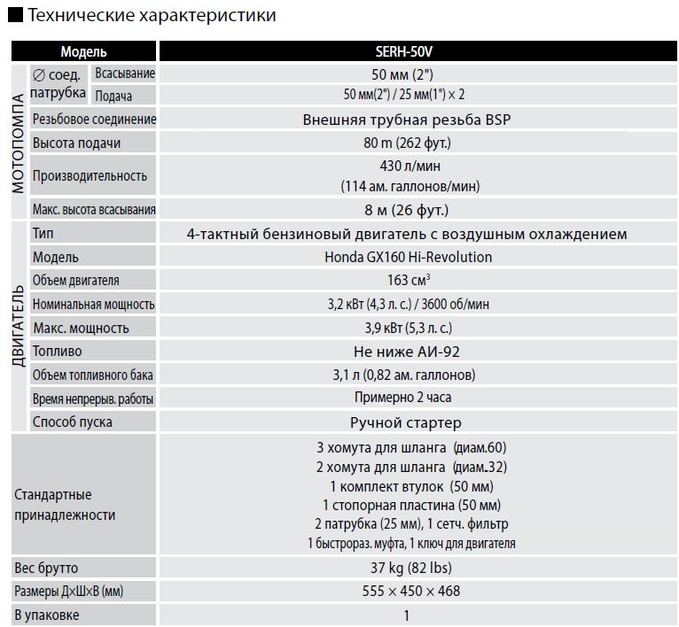 позволяет применять мотопомпу в качестве пожарной или для подачи воды на высоту до 50 метров