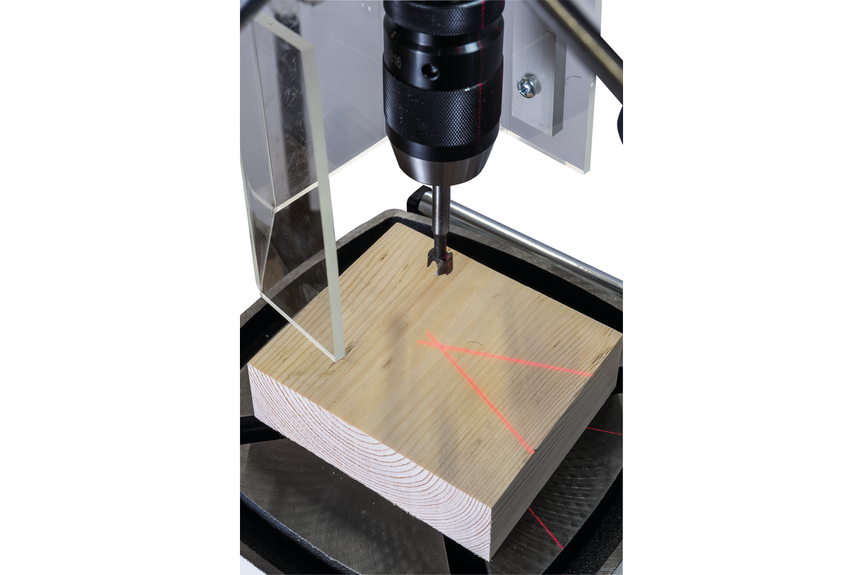 Предусмотрен светодиодный фонарик с выключателем для подсветки рабочей области и лазерный указатель оси сверления.