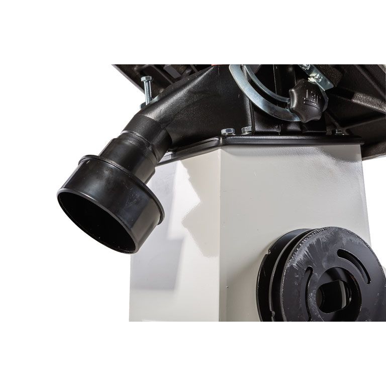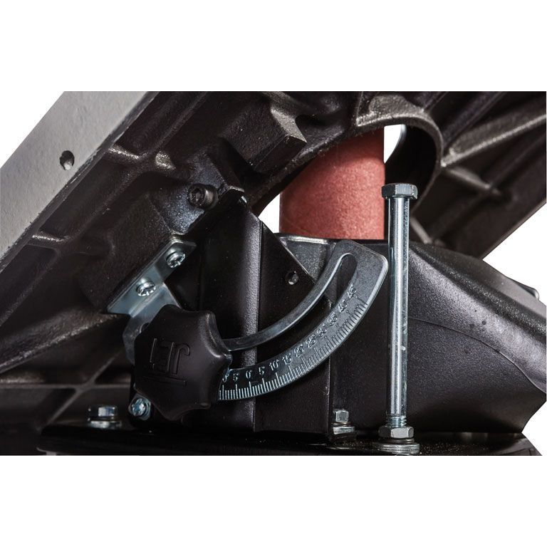 Мощный асинхронный двигатель рассчитан на продолжительную эксплуатацию, массивный корпус на резиновых опорах и тяжёлый чугунный стол хорошо поглощают вибрации. Есть механизм наклона стола на угол до 45°, чтобы шлифовать под углом.